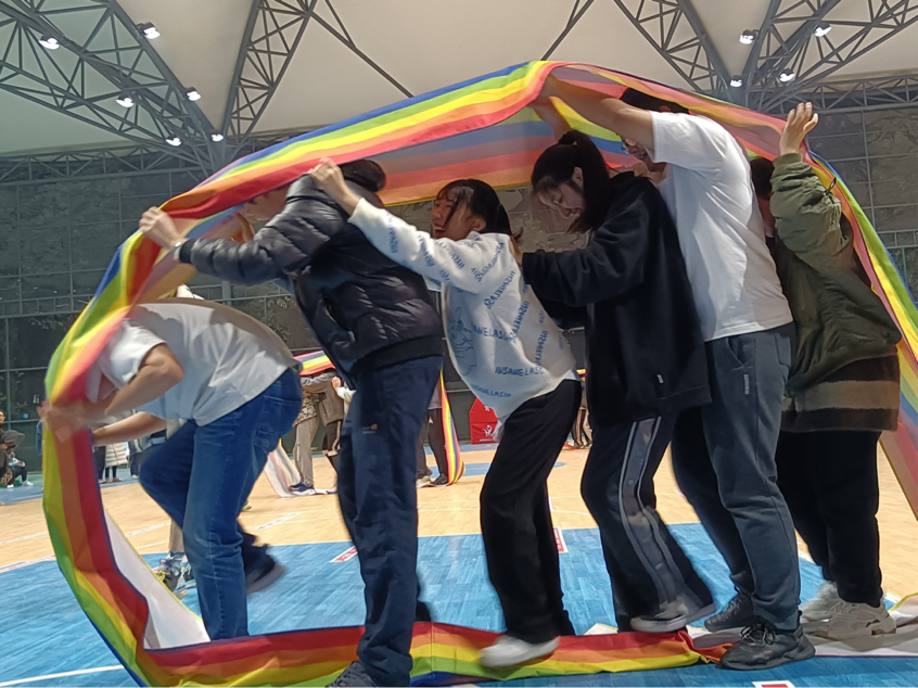 第二项比赛是“无敌风火轮”。参赛队员们站在闭合的“履带”里,充当着“轮胎”的角色,驱动着“履带”向前。这是一个对参赛者间默契要求尤为苛刻的项目,在考验大家默契的同时也为现场增添了不少欢笑声。在众多团队中,大二二班脱颖而出,展现出杰出的团队默契以及手脚配合能力,一往无前,拿到该项头名。