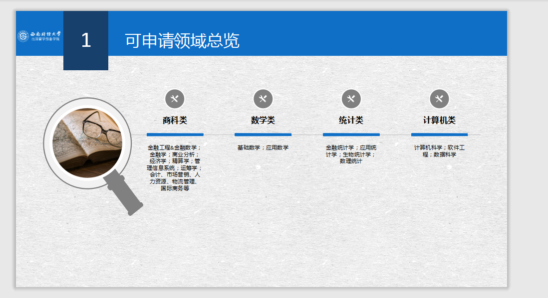 因为数学专业比较万能,因此研究生可以申请的领域比较广泛,比如:商科类、数学类、统计学类、计算机类。