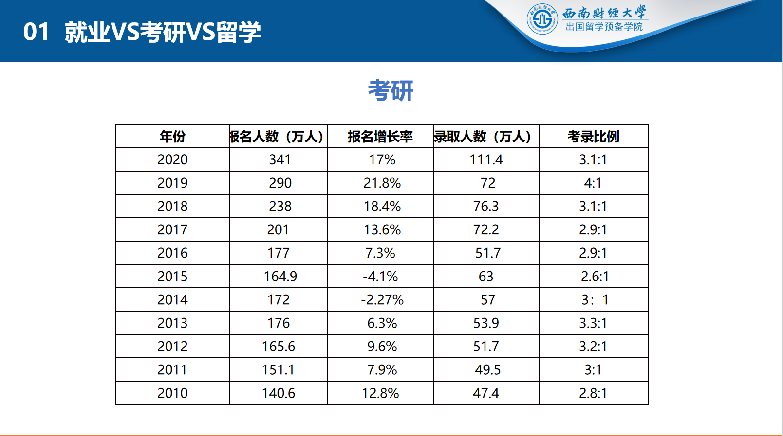 又是一年考研月,在目前国内严峻的就业形势和复杂的留学环境下,西财学子亟需从自身出发,重新确立发展定位,追求卓越,面对考研、就业与留学三岔路时做出正确合适的选择,为自己的未来争取更多的机会。