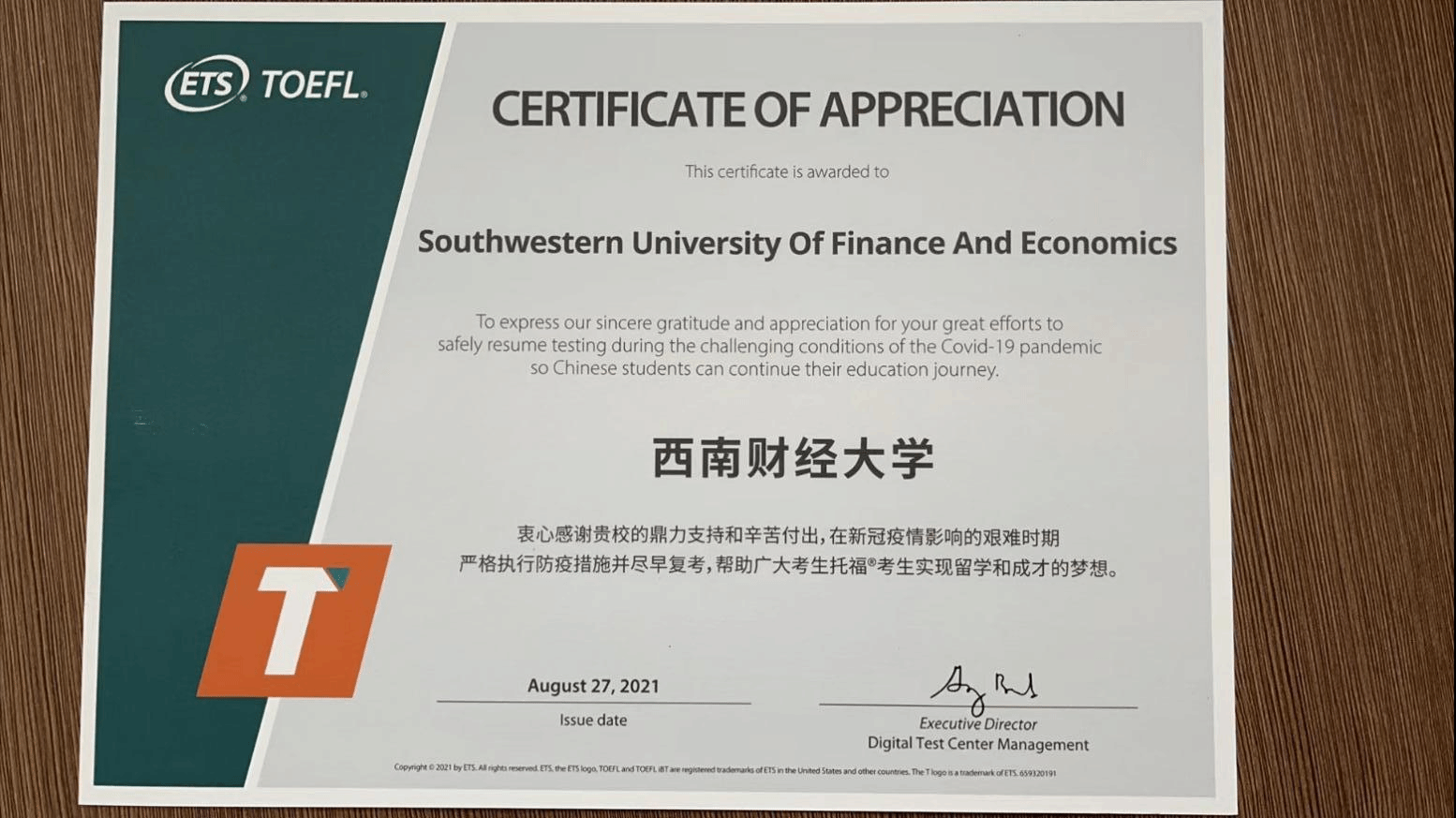 允许的前提下,完成了相关场次的托福、GRE考试组考与承办工作,为考生提供了优质周到的考务服务并保障了考生与全校师生的健康安全。为此,我校考点也获得了托福、GRE考试主办方美国教育考试服务中心(ETS)所颁发的感谢状。