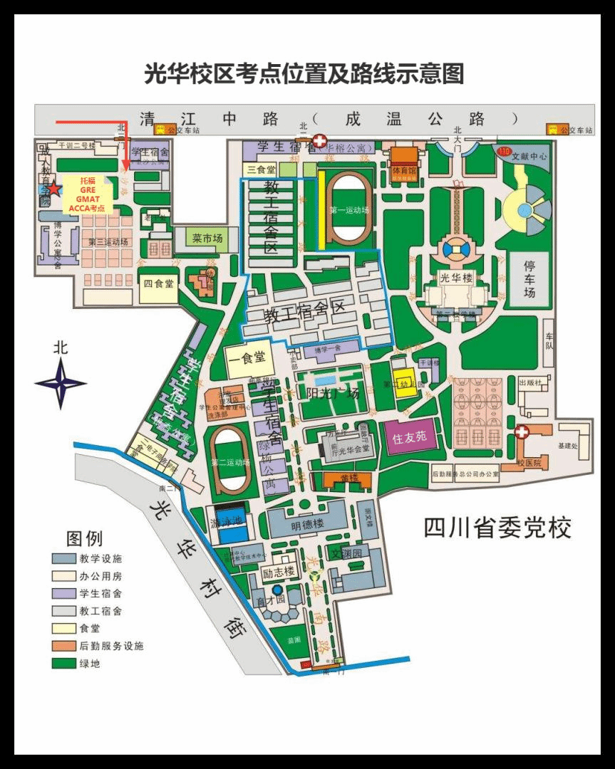 光华校区北三门进出。北三门位于成都市青羊区清江中路57号,地铁四号线B出口前方约10米,金沙公交枢纽站对面。光华校区其它校门不允许考生进出。