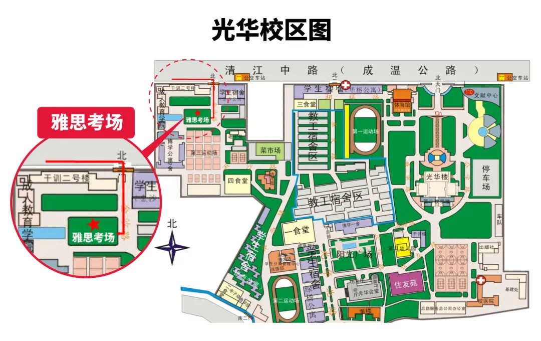 YourComputer-delivered testandSpeaking testwill take place atthe 1st Floor of West Teaching Building,Guanghua Campus. It is highly recommended that youYou can enter the test center by subway, bus or taxi from the North gate of Guanghua Campus.