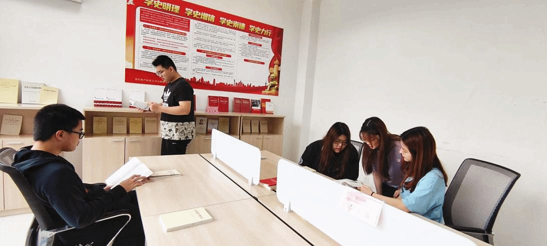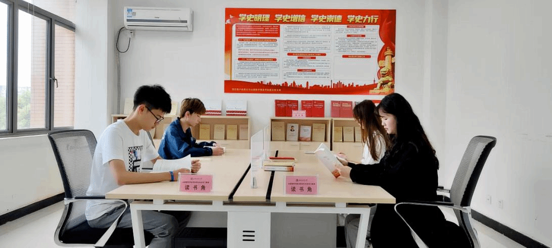党史学习阅读角——设立学生读书角,学生自学为主,结合主题班会、专家党课、专题讲座、研讨会等多种形式,促进学生认真学习《中国共产党历史大学生读本》、《中华人民共和国史大学生读本》、《改革开放史大学生读本》、《社会主义发展史大学生读本》、《道路何以自信》、《理论何以自信》、《制度何以自信》、《文化何以自信》等书目。