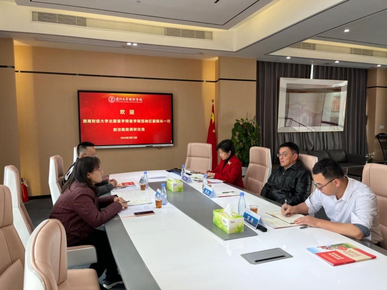 副院长范映红及项目办公室主任何军一行前往厦门大学国际学院进行调研。厦门大学国际学院院长陶涛、学院招生部门负责人戴玉和办公室主任艾浩参加接待并举行交流会谈。