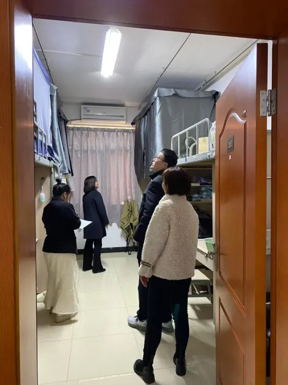 检查期间,副院长邓忠波与随行老师根据宿舍实际情况,调研公共区域设施老化、寝室升级改造、修剪树枝、更换报栏等问题,要求相关部门制定方案定期落实优化项目。